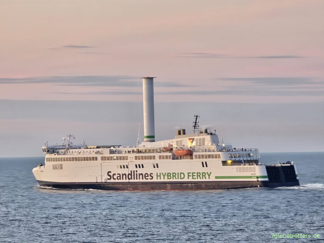 Für Fährenliebhaber wie mich ist Gedser Odde ein schöner Spot. Das hier ist um 17.43 Uhr die einlaufende Scandlines-Hybridfähre aus Rostock. Schön zu erkennen am Rotorsegel.