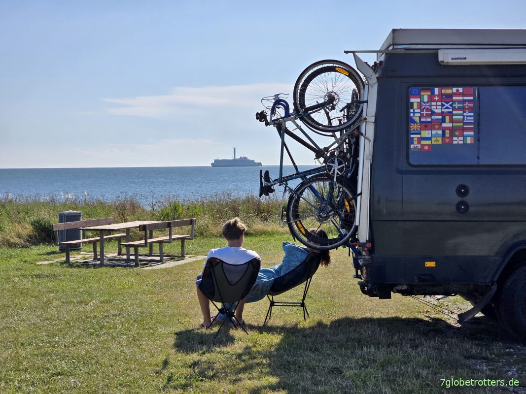 Die diesjährige schwedische Sonne ist wirklich unerbittlich. Der Jüngste kommt schon 8 Uhr aus dem Aufstelldach runter, weil dort die Sonne so dermaßen reinknallt, dass er es nicht länger aushält und seinen Platz auf dem Sofa einnimmt. Bislang wurde ja immer durchgesetzt, dass das Zelt hochgemacht wird, aber jetzt erst merken alle, dass das wirklich auch sinnvoll ist. Da geht zwar der schöne Frischlufteffekt verloren, aber wenn die Sonne schon früh um 4 Uhr scheint, ist es im Aufstelldach anders nicht auszuhalten.