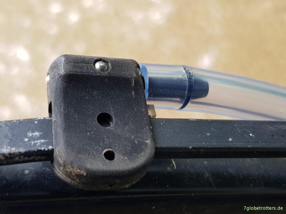 Muss mal den Engpass suchen. Vorn am Wischwasserbehälter fängt die Wasserleitung zwar mit üppigen 12 mm Innendurchmesser an. Aber spätestens am Verteilerstück ist das erste Nadelöhr der Scheibenwaschanlage. Kein Wunder, denn der Innendurchmesser liegt hier bei nur noch 3 mm. Und das auch noch vor der Abzweigung.