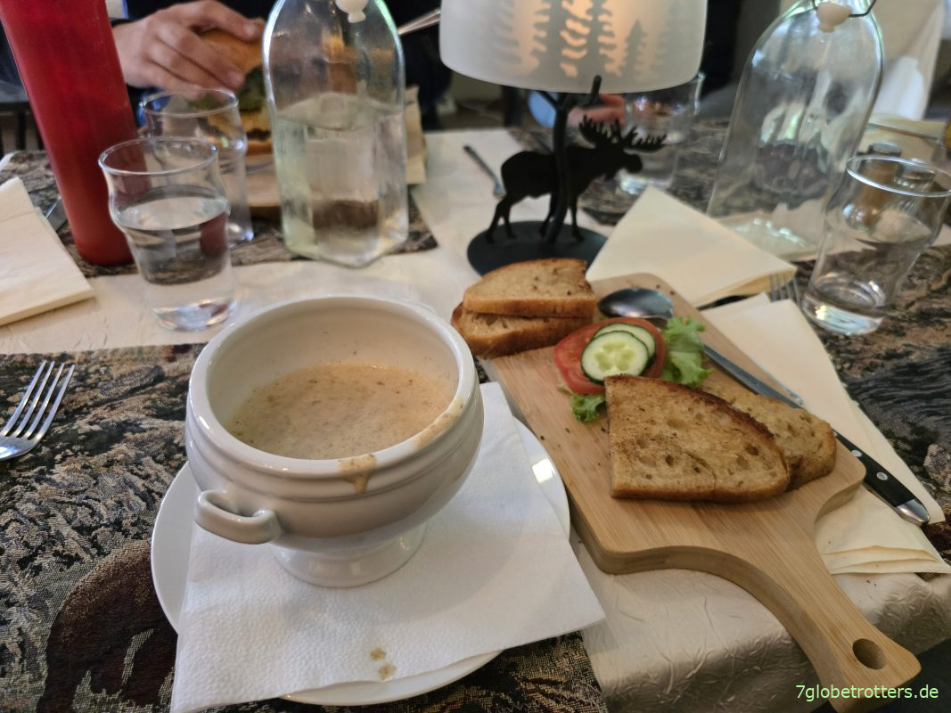 Aber ich werde schon was finden. Der ganze Gourmetschuppen ist dekoriert mit kleinen Trollen und ausgestopften Tieren. Wirt und Kneipe scheinen echte Originale zu sein. Gibt auch eine Auszeichnung aus dem September 1999 mit dem Titel “Gourmet mitten im Wald“. Und ebenselbiger holt mich mit Brot und Butter zur Begrüßung schon mal genau richtig ab. Dazu kommt ein kleiner Salat. Erst dann werden die bestellten Hauptessen sowie Pilzsuppe und Knoblauchbrot für mich serviert.
