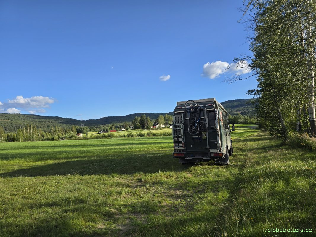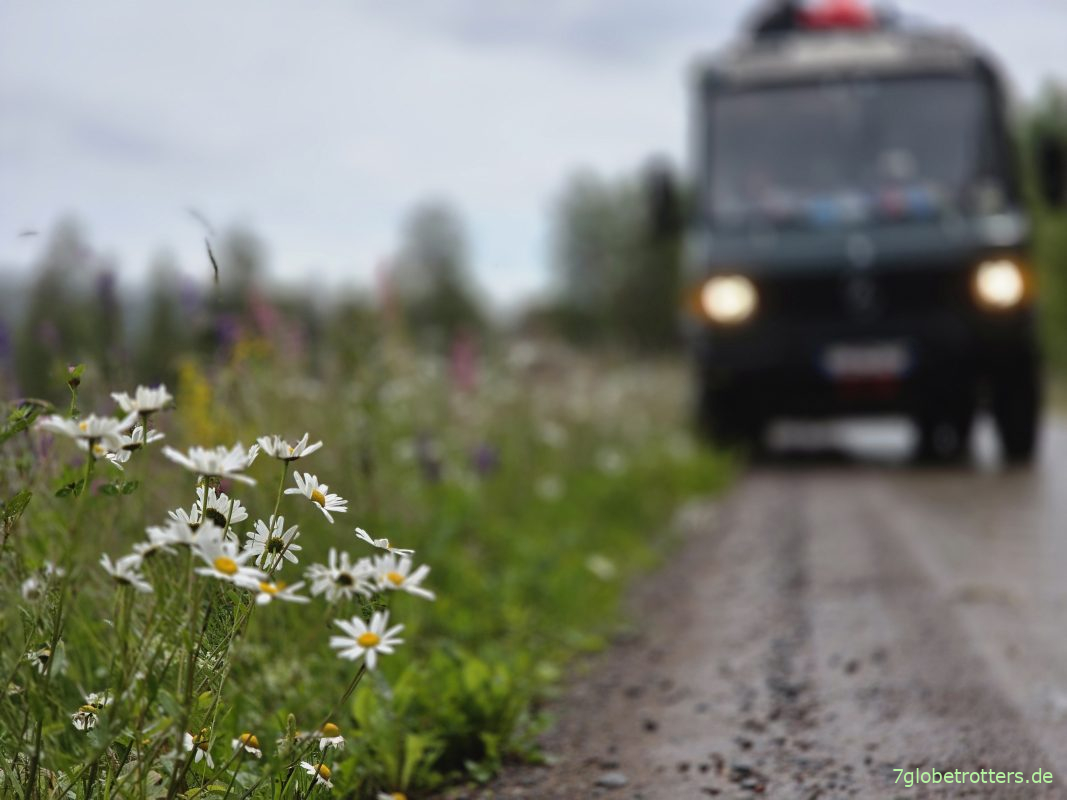 Nebenbei läuft schon mal die Dieselheizung und wärmt den Motor vor. Die Zielpeilung richte ich auf den Vøringsfossen, einen großen Wasserfall in Norwegen, stelle aber die Mapy-Navigation auf kürzeste Route ein, was immer ganz interessante Strecken ergibt. Und so hoppern wir schon ab Rottneros über kleine Waldpisten quer durch große Margeriten- und Lupinenbestände. Die Tiefenunschärfe simuliert mein (angebliches) Superhandy eigentlich ganz gut, aber bei dünnen grünen Stängeln vor einer grünen Wiese scheitert mein S24 Ultra regelmäßig. Das hat die Canon EOS R7 im Test besser hingekriegt.