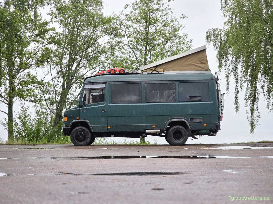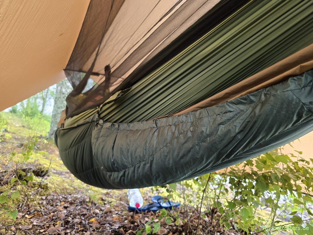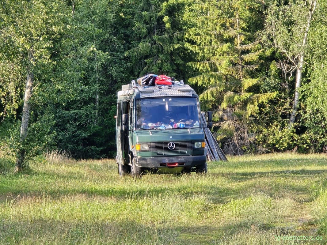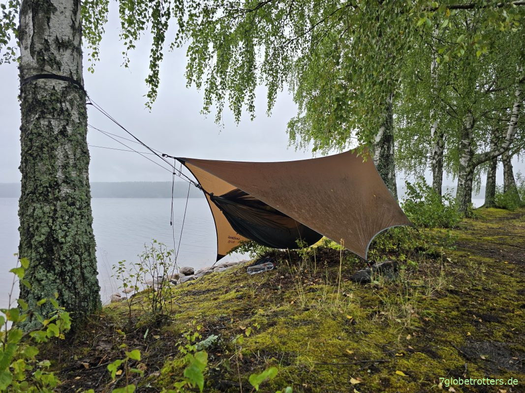 In der Nacht hat es ganz schön geregnet. Zum Glück ist diesmal die Schwedenklappe zu und das Dach wieder dicht. Der Jüngste war die ganze Zeit draußen in der Hängematte, aber das Tarp ist dicht.