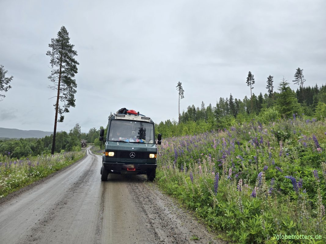 Kurz nach der Gourmetkneipe passieren wir bei Samuelsbråtan die norwegische Grenze, sind aber immer noch auf kleinen Waldwegen quer durch üppige Lupinenbestände unterwegs. Die Lupinen werden übrigens als invasive Art von Schweden und Norwegen bekämpft. Und wir freuen uns noch an deren für die heimische Natur gefährlichen Schönheit.