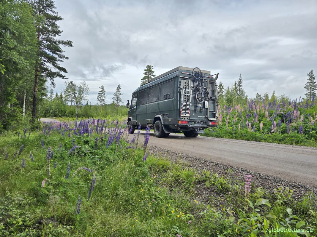 Ist eine schöne Gegend in den Bergen westlich der Frykenseen. Muss ständig anhalten für ein Foto vom Mercedes 711D in den Lupinen. Glaub schon, dass die Busfotoritis krankhaft ist.