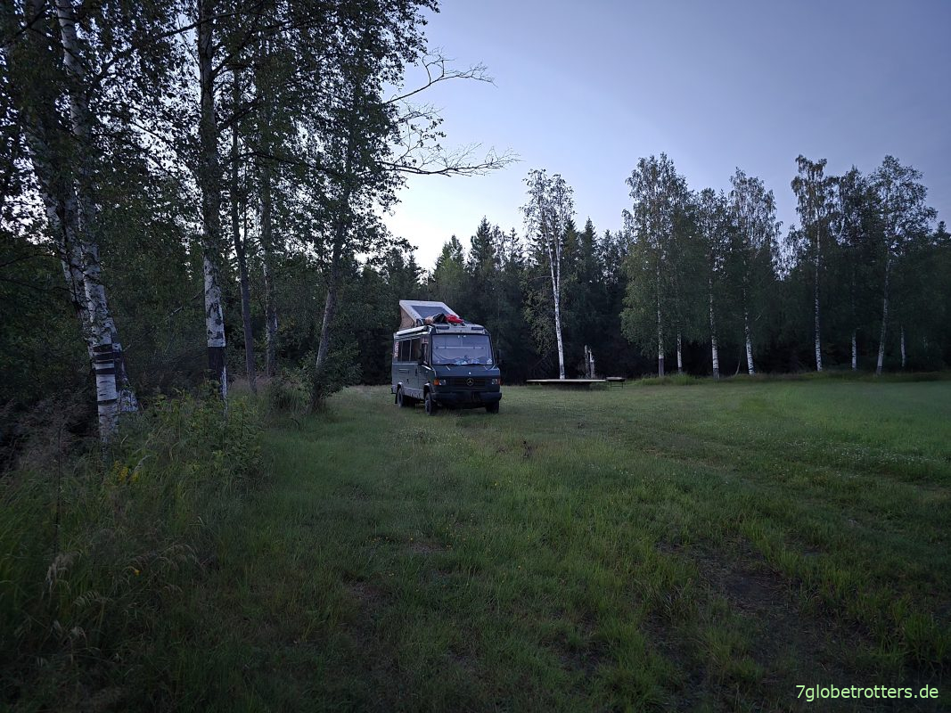 Ab 19:00 Uhr suche ich langsam nach einem Stellplatz. Fahre extra kleine Nebenstraßen neben der Hauptroute und sehe 19:45 Uhr einen Rastplatz am Fluss. So richtig mit offizieller Lagerfeuerstelle, großem Holzstapel und einem riesigen Tisch. Aber in unmittelbarer Sichtweite des nächsten Dorfes. Mal sehen.