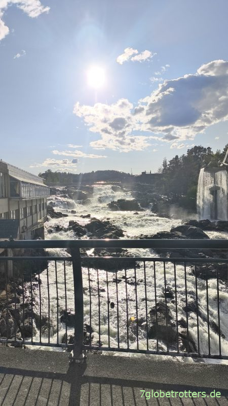 Ab Austmarka gibt’s auch wieder richtige Straßen. Muss teilweise sogar Maut bezahlen. In Kongsvinger putzt meine Tochter die Seitenfenster, denn mir fehlen immer noch die vorderen Spritzlappen und ihr wird schwindlig, wenn die extra schon ersetzten Seitenfenster nicht klar sind. Früher hat mein Vierter bei jedem Tankstopp routinemäßig geputzt, aber die Zeiten sind vorbei. Dafür macht er (wenn er Lust hat) von seinem exponierten Beifahrersitz auf Kommando Fotos, hier vom Stadtwasserfall in Hønefoss. Ja, er genießt seine Position, die ihm auch niemand streitig macht.