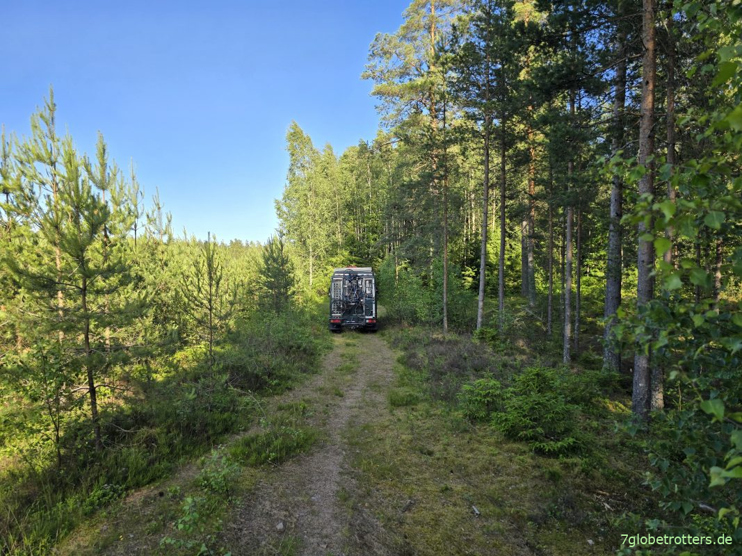 Kurz vor der Autobahn zwischen Göteborg und Örebro suche ich einen See raus. Der ist zwar ganz nett, aber eben noch nicht so richtig schwedisch toll. Vor allem komme ich mit dem Bus nicht direkt ans Wasser. Selbst ein Unimog würde da nicht rankommen. Der Wald wird einfach zu dicht. Bin zwar auch schon Fahrzeuge gefahren, mit denen man quer durch diesen jungen Wald käme, aber das ist hier keine Option.