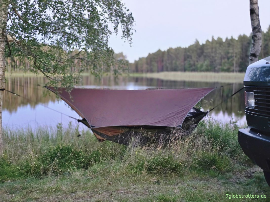 22:30 Uhr baue ich mir die Hängematte auf. Hab selbst für ein Zelt noch nie so lange gebraucht wie für die Hängematte. Und dabei habe ich das schon mal geübt. Aber das Befestigungsseil ist eben wirklich komisch. Wobei nicht die Befestigung komisch ist, die ist schon richtig raffiniert gelöst. Ich bin einfach nur zu dumm, mir die richtigen Handgriffe zu merken und muss mir x-mal ein Youtube-Video zur Amazonas-Hängematte anschauen. Mann, ist das peinlich.