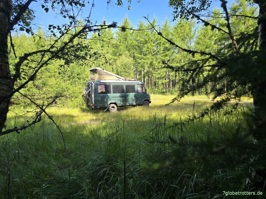 Eigentlich wollen wir mit dem Lagerfeuer noch warten, bis es dunkel ist, aber das ist ja hier im nördlichen Südschweden Ende Juni vollkommen witzlos. Da müssten wir ja noch Monate warten. Also machen die Jungs bei schönstem Sonnenschein das Feuer an, während ich mich weiter um meine Solarprobleme kümmere. Und das heißt ganz konkret, meine Elektrokiste zu suchen, die immer noch verschollen ist.