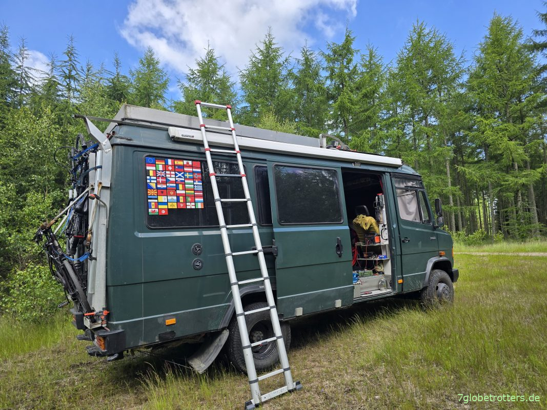 Doch mein Jüngster hat dank seiner anwendungsbereiten Kenntnisse aus dem Physikunterricht eine rettende Idee. Ich soll das Solarpanel einfach zur Hälfte abdecken. Da wäre ich nicht drauf gekommen, mache mich aber gleich an die praktische Umsetzung. Hab ja trotz der Platzprobleme wegen der komplett mitgeführten Paddelausrüstung die Auszugsleiter mit. Also nicht trotz, sondern wegen, denn ich brauche die 11-stufige Hailo, um unser Übergepäck auf dem Dach zu verstauen. Hab dadurch auch einen schönen Zugang zur Solaranlage.