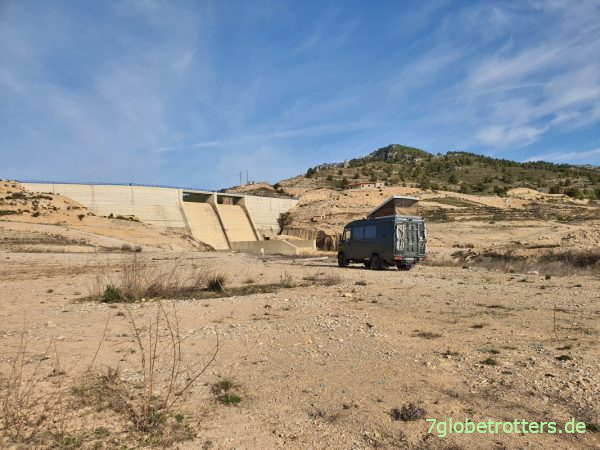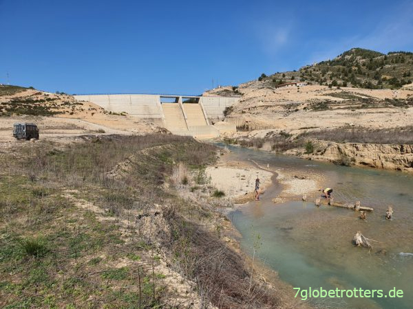 Nach dem Mittagessen gehen die Jungs noch ein wenig ans Wasser, verlieren aber dann irgendwann die Lust am Buddeln. Also fahren wir 15:00 Uhr doch noch weiter. Da wir ja auf dem Grund des alten Stausees stehen und die Piste zurück auf den Damm steil und voller Steine ist, heize ich den Motor schön vor und schicke die Jungs alleine los. Mit ein bisschen Schwung und Vollgas ist aber auch dieser Anstieg kein Problem. So ein schöner Bus.