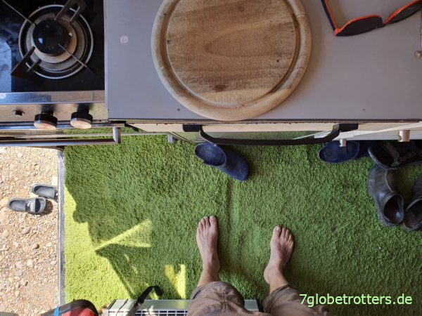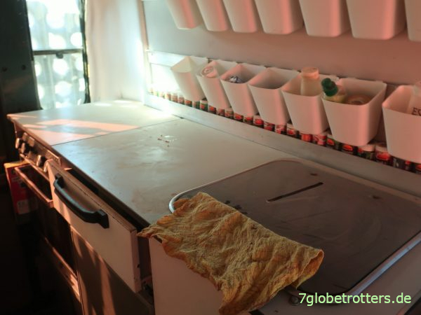 Und da sehen wir das Dilemma. Der Bus ist hinten total verdreckt. Der ganze Staub ist durch das Küchenfenster reingezogen. Eine dicke Staubschicht liegt im ganzen Bus. Komisch, dass wir das während der Fahrt nicht gemerkt haben.