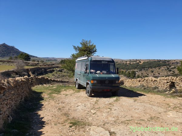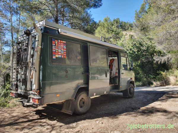 Der Bus steht hier oberhalb vom Thermalbad Montanejos voll im Schatten und so schlafen heute alle bis mindestens 9 Uhr. Draußen ist in 50 Meter Entfernung vom Bus schon praller Sonnenschein und es ist richtig warm. Aber bei uns läuft zum Frühstück die Dieselheizung.