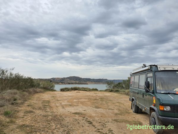 Suche also immer nach kleinen Pisten und fahre die erstbeste Möglichkeit links rein. Die Piste ist zwar extrem ausgefahren, aber dennoch ein Volltreffer, denn schon bald stehen wir in einem ausgetrockneten Flussbett voller loser Steine. Das geht natürlich alles auch ohne Allrad, ich muss nur schön vorsichtig fahren, damit sich der 4×2-Camper nicht einwühlt. Lose Kieselsteine sind da fast noch dümmer als Sand. Naja, und für die Verschränkung auf der Einstiegspiste ist es egal, ob ein Kastenwagen-Vario Allrad hat oder nicht. Hauptsache, der hat genug Bodenfreiheit. Und die 40 cm weniger Breite gegenüber einem „richtigen“ LKW machen sich natürlich auch positiv bemerkbar.