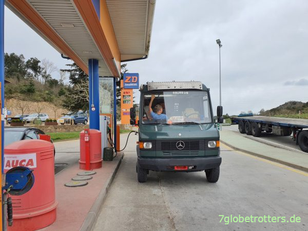 Also da hin. Entsorgung gibt es nicht. Dafür fordern mich die Jungs auf, den Nervenkitzel zu beenden und jetzt schon vollzutanken. Na gut. Ist ja auch viel entspannter, mit vollen Tanks durch die Pyrenäen zu fahren, auch wenn wir da berghoch noch langsamer sind. Wobei die Jungs schon recht haben, denn jetzt geht es auch wieder viel runter und da können wir die potentielle Energie von 125,8 zusätzlichen Litern Diesel voll ausschöpfen.