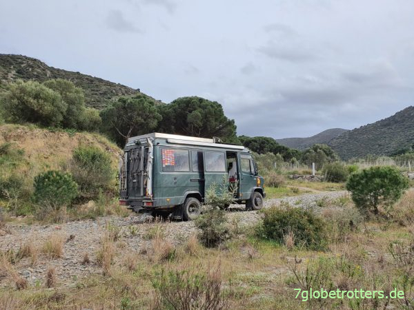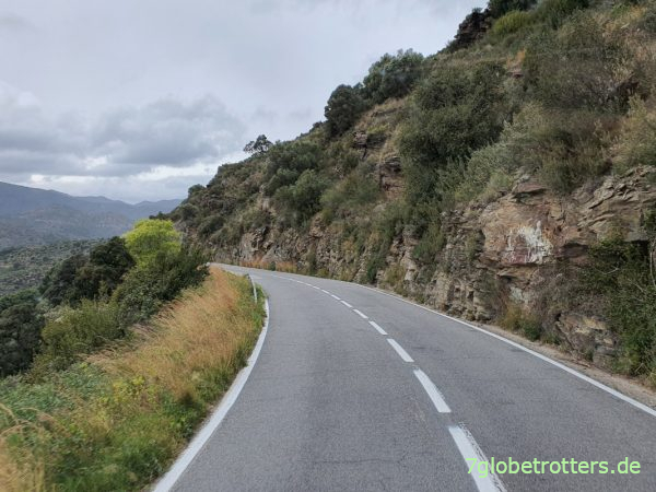 Da wir jetzt genug Sprit und auch noch genug Zeit haben, können wir den Umweg über Portbou fahren. Denn ich will aus coronataktischen Gründen kurz vor der französischen Grenze übernachten und für den frühzeitigen Grenzübertritt lieber abseitige Straßen nutzen. Da ist die Kontrollwahrscheinlichkeit geringer. Zweigen also in Figueres von der N-II auf die N-260 ab. Die schlängelt sich ab El Port durch die letzten Ausläufer der Pyrenäen zum Mittelmeer. Sehr schön hier. Nur gibt es keine Stellplätze, zumindest keine versteckten. Und weil uns wegen der katalonischen Corona-Ausgangssperre niemand sehen soll, kann ich auch nicht einfach neben der Straße stehen.
