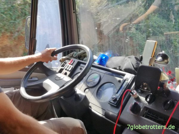 Nach dem Baden räumen wir den Bus auf und packen alles zusammen, während die Dieselheizung den Motor vorwärmt. Dann laufen die Jungs schon mal die Piste hoch. Schließlich muss jemand oben die Ausfahrt freihalten. Denn ich komme die Piste nur mit Schwung hoch und kann oben am steilsten Stück die Straße nicht einsehen.