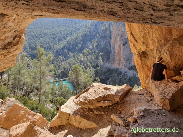 Das letzte Kletterstück bis zur Höhle müssen die Jungs ihre Schlapperschuhe ausziehen und barfuß klettern. Denn keiner will den Ausblick aus dieser sehr hübschen und sehr einsamen Höhle runter auf den Rio Mijares verpassen.
