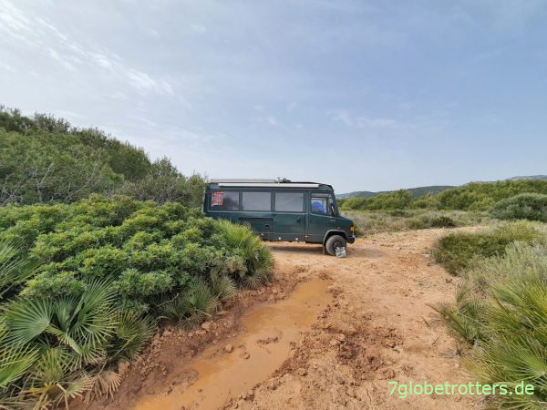Wie wir am späten Nachmittag am Strand sitzen und Skat spielen, fährt ein Ranger langsam an uns vorbei. Und natürlich entdeckt er den Bus. Ich gehe also mal hin und sehe nach dem rechten. Da steht er nun und weiß nicht so richtig, was er mit uns anfangen soll. Findet es jedenfalls nicht so toll, wie ich den Bus rückwärts in die spanische Vegetation geschoben habe. Naja, ich dachte, das sind nur ein paar vertrocknete Halme. Aber das ist halt ein Naturpark hier.
