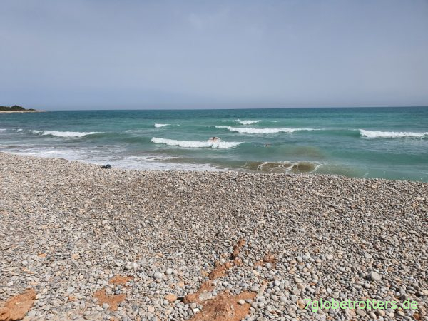 Klettern auch heute wieder über die Felsen zur kleinen Bucht. Denn ein bisschen Bewegung vor dem Mittagessen muss sein. Dort sammeln wir Steine, Muscheln und Schneckenhäuser mit Löchern. Aber Sandstrand ist trotzdem besser, weshalb ich nun doch den Motor vorheize und rüber zum gestern entdeckten Megastrand fahre.