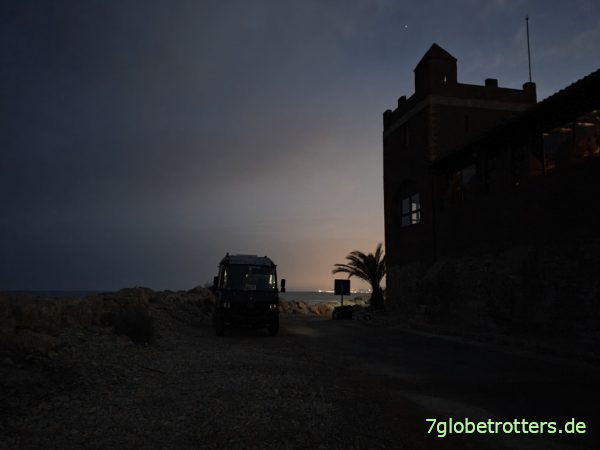 Aber erstmal wird fertig gebadet. Gegen 19:00 Uhr packen wir etwas wehmütig zusammen und rollen über die Piste weiter nach Süden. Werden dann in einem kleinen Dorf am Ende einer Sackgasse neben einem geschlossenen Hotel fündig. Ist doch auch ganz nett.