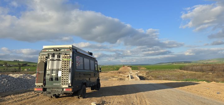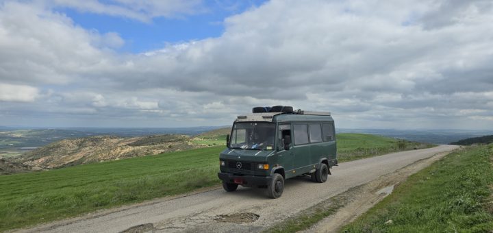 Am letzten Tag auf dem Parkplatz am Mides Family Resto testen wir, wie sich der Bus mit Arm und Bein im Gips so fährt.