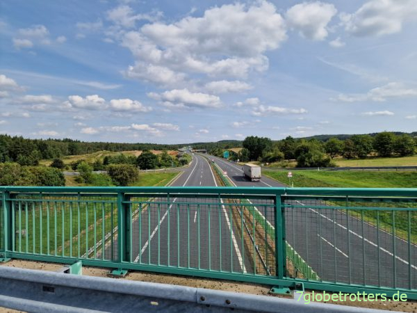Krásny Les hatte ich total vergessen, dabei ist Schönwald mit „74 alten Bauerngütern das größte Waldhufendorf des ganzen Bezirkes Aussig“ (Wiki). Danach aber verliere ich völlig die Orientierung, als an der Oelsener Höhe die tschechische Autobahn in Sicht kommt. Muss erstmal stehen bleiben und mich orientieren. Wo ist nun Dresden und wo Prag? Mein Sohn kann meine Unfähigkeit gar nicht fassen. Ja, so habe ich die Autobahn hier oben noch nie gesehen.