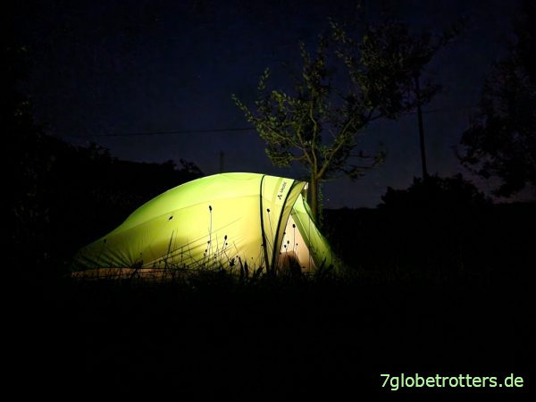 Dann vertun wir uns die Zeit und warten auf das Abendbrot. Und endlich kann ich auch wieder mal mein geliebtes Vaude Hogan aufbauen, auch wenn das mit 1,2 kg nicht nur superultraleicht, sondern mit zwei erwachsenen Männern vor allem auch superultraklein ist. Ich muss echt die Sache mit den Hängematten forcieren.